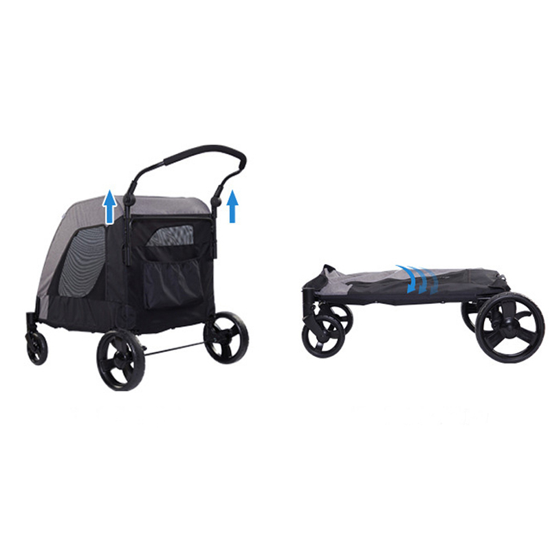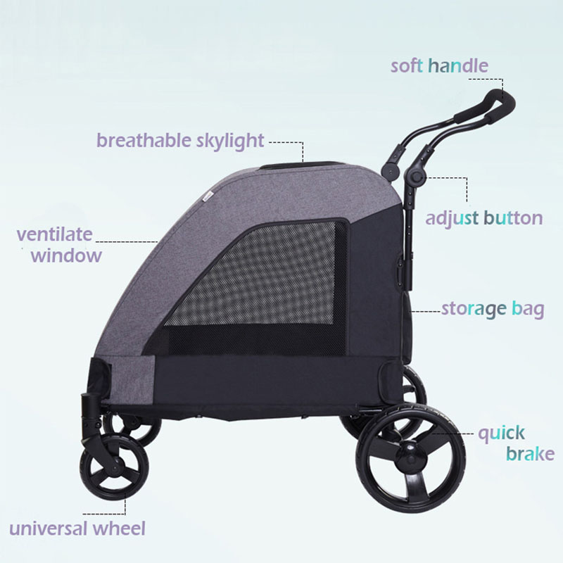 Poussette pour chien de taille moyenne, capacité 20 % supérieureConçu pour le confort et la praticité, il offre une capacité accrue de 20 %, une garde au sol facile à monter et une poignée gainée de mousse pour une conduite confortable. Équipé de sacs à déjections canines, d'un espace de rangement et de roues pivotantes à 360° avec frein à pied, il est idéal pour des aventures sereines sur tous les terrains.
