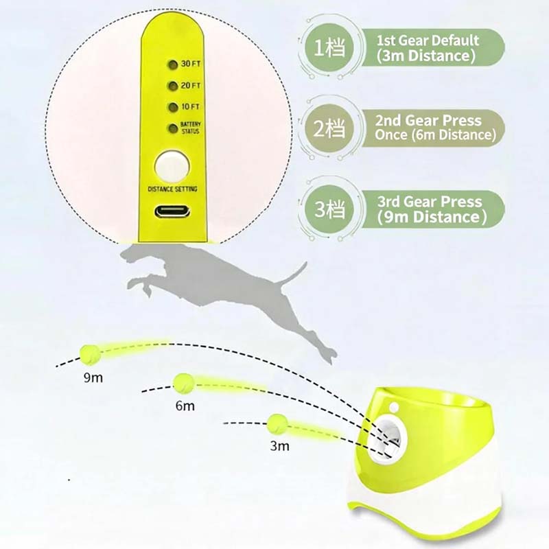 Ce lanceur propose trois modes de distance de rebond réglables pour s'adapter à différents espaces et tailles de chiens. Avec une autonomie allant jusqu'à 4 à 5 heures après une charge complète via USB Type-C, il offre un divertissement fiable et mains libres, même en votre absence. Il suffit d'insérer les balles de tennis haute élasticité fournies, de sélectionner votre mode préféré et de laisser votre chien s'amuser en toute liberté !