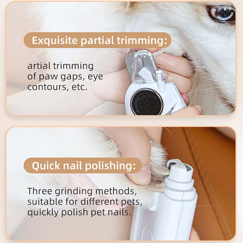 Notre Limeuse et coupe-ongles électrique professionnelle pour animaux de compagnie Ce rasoir électrique assure un toilettage sûr et précis pour les chiens et les chats de toutes tailles. Doté d'une lumière LED intégrée pour une visibilité optimale, d'un écran intelligent pour un suivi en temps réel et d'une fonction de limage professionnelle, il prévient le limage excessif et protège la peau de votre animal. Son interface de charge rapide USB-C élimine les problèmes de remplacement de batterie, et son action de limage douce offre une finition polie digne d'un salon de toilettage.