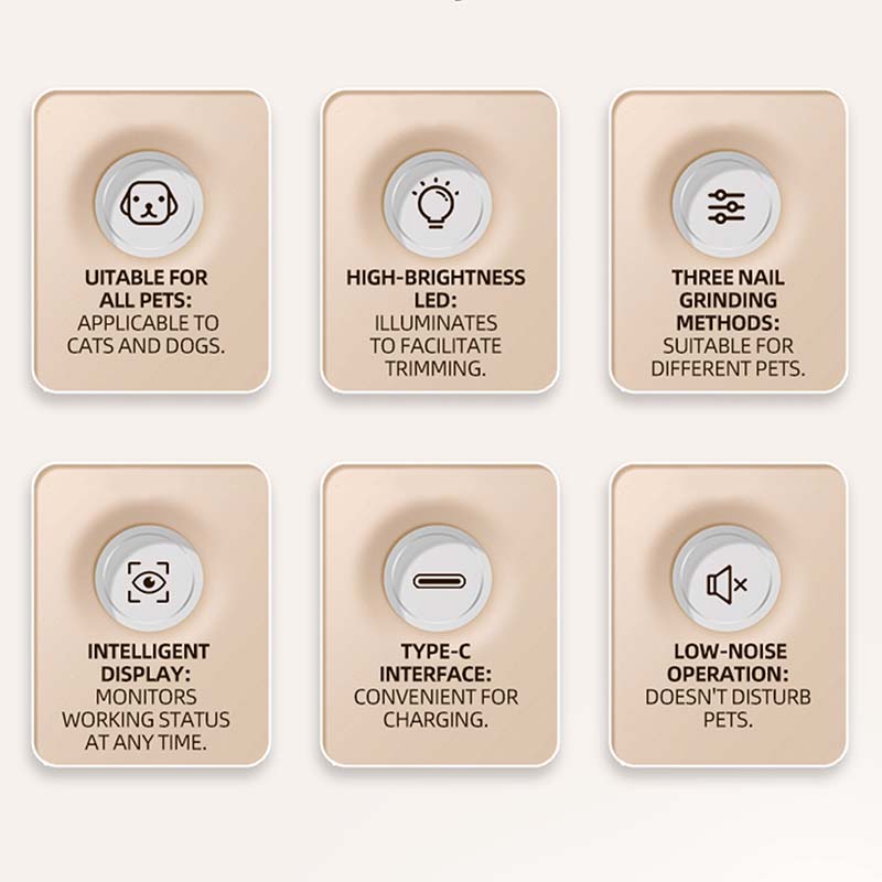 1. Lumière LED intégrée La lumière LED intégrée offre une visibilité optimale pendant le toilettage, évitant ainsi les coupes à l'aveugle et protégeant le pelage de votre animal des blessures. 2. Surveillance par affichage intelligent L'affichage intelligent suit en temps réel l'état de fonctionnement, notamment le niveau de batterie et le mode de fonctionnement, vous permettant ainsi de connaître l'état de l'appareil en un coup d'œil. 3. Fonction de meulage professionnelle : La tête de meulage haute performance polit en douceur les bords tranchants des griffes, offrant une finition polie douce et digne d'un salon de beauté pour les chiens et les chats de toutes tailles. 4. Chargement pratique de type C : L'interface universelle Type-C permet une charge rapide et facile à tout moment et en tout lieu, éliminant ainsi le problème du remplacement de la batterie.